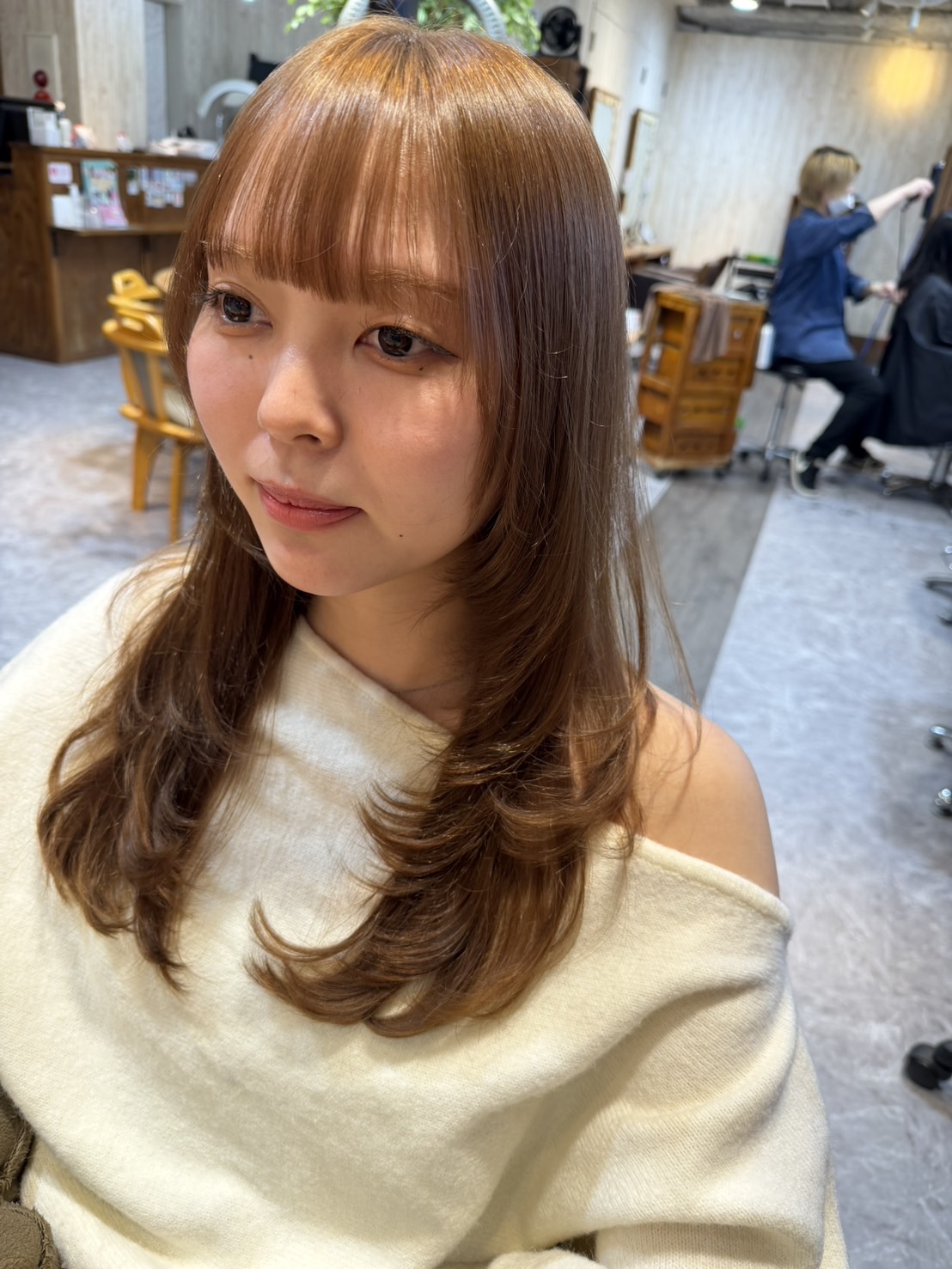 透け感のあるベージュカラーにレイヤーが可愛い! ワンカールで立体感が出て、毎日のスタイリングも簡単