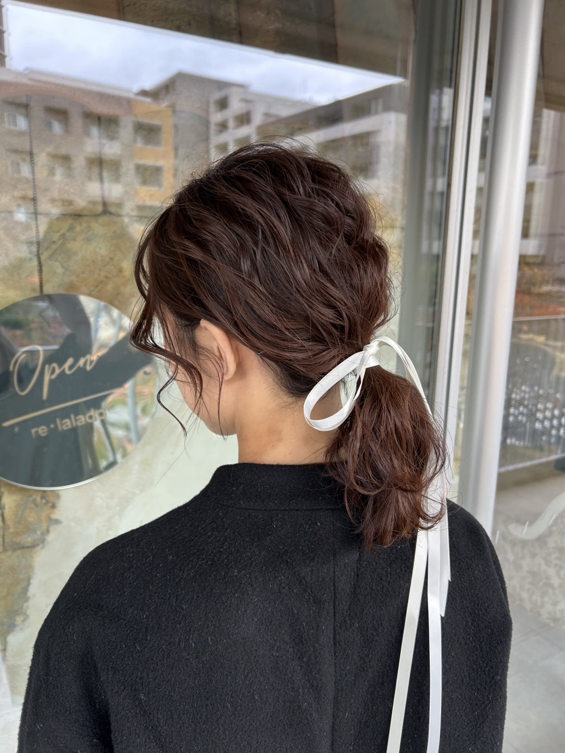 シアー感のあるリボンを結ぶことで大人可愛い印象に。 普段使いはもちろん、デートやお呼ばれヘアにもぴったりのスタイルです。