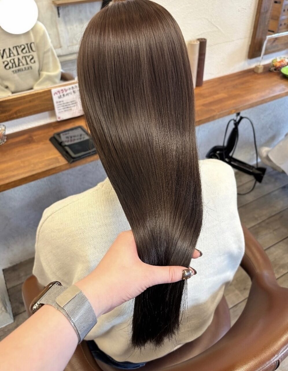 メテオカラーで作るうるうるダークブラウンヘア♪ メテオトリートメント配合のカラーで水分力、艶感たっぷりの髪を作ります! 毛先もすき過ぎないようにして、おろしても巻いても色気のでるカットです♪ 秋冬の乾燥時期に是非メテオトリートメントご体験してみてください!