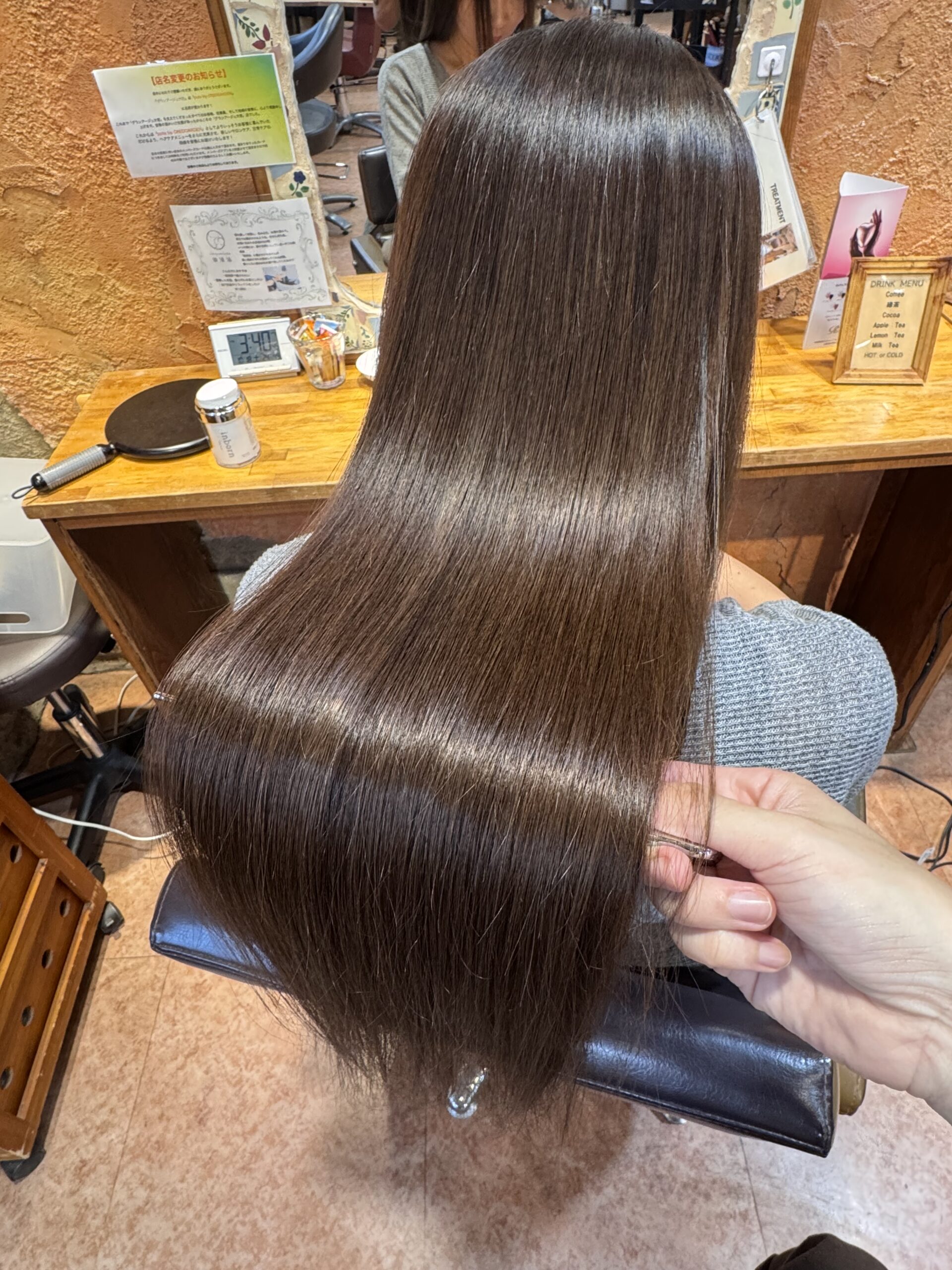 髪の毛に合わせた独自ブレンドの髪質改善トリートメントをカラー剤に配合し、本来施術と共に失ってしまう栄養素を補給しながらカラーリング出来る当店のイチオシカラー