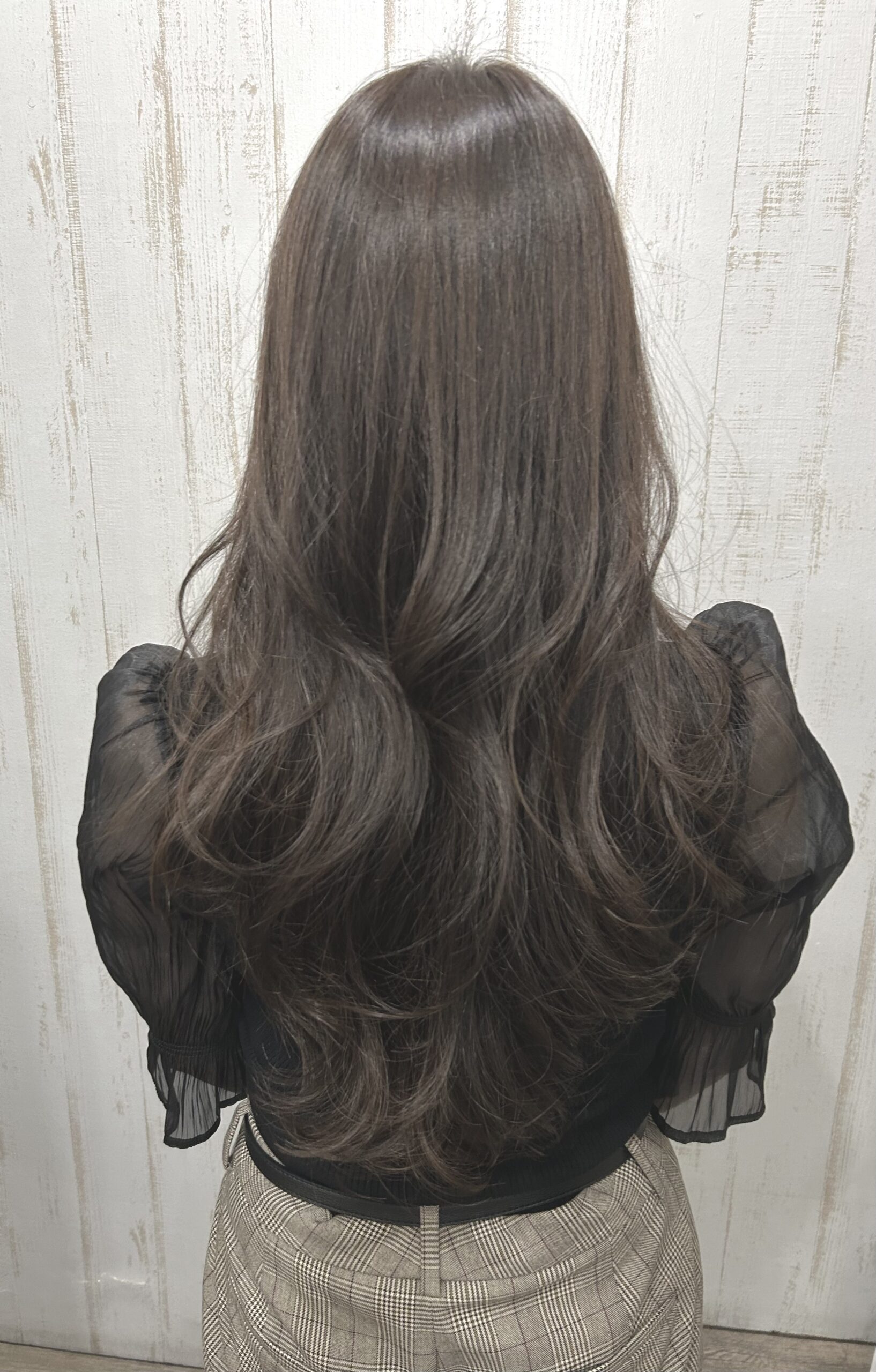 艶やかで柔らかな質感のロングスタイル。顔まわりから自然に繋がるレイヤーで、動きを出しながらもまとまりやすく仕上げました。重さを残しつつ軽さを表現しているので、大人女性にもおすすめ。透明感のあるカラーと合わせることで、より上品な印象に仕上がります! 是非お任せ下さい!