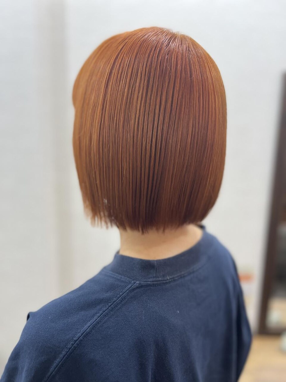 全体をあごラインに合わせてカットしたワンレングスのストレートボブ。 毛先をやや内に入れつつも、ストレートアイロンで自然なツヤを出すことで、シンプルながら上品な印象に仕上がっています。 カラーはオレンジブラウン系で、柔らかい光の下では暖かみのあるツヤが際立ち、 肌色を明るく見せてくれるのが特徴です。