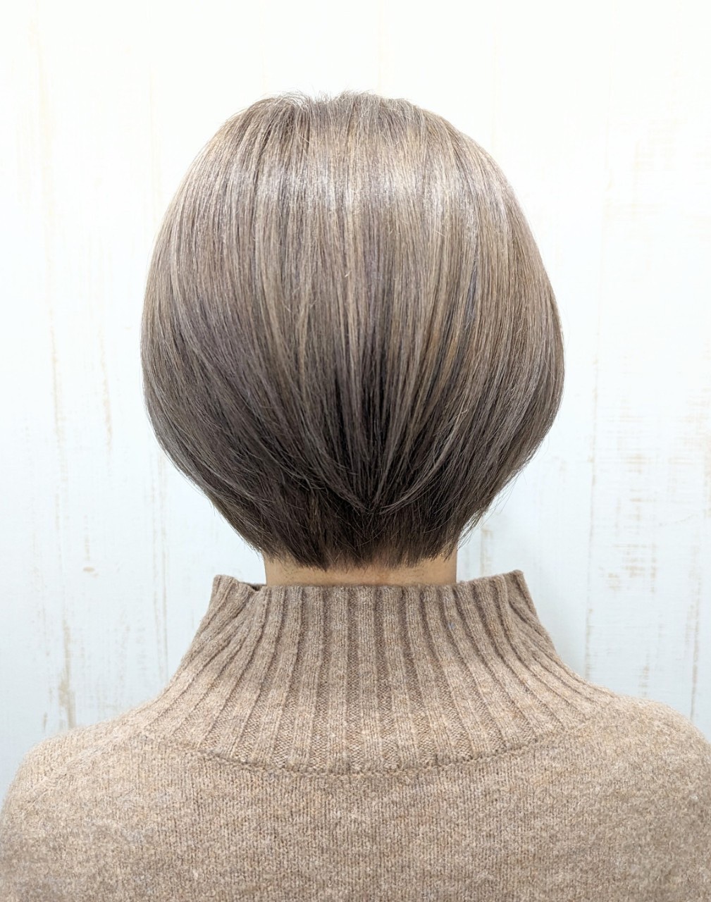 丸みのあるシルエットが美しい【大人ショートボブ】スタイル。 後頭部に自然なボリュームを出し、襟足をすっきりと締めることで、横顔から見ても上品でバランスの良い仕上がりに。 カラーは透明感のあるベージュ系カラーをベースに、細かいハイライトを加えて立体感を演出。 光の当たり方で柔らかく見えるので、暗めのトーンでも重たくならず、大人女性に人気のカラーです。