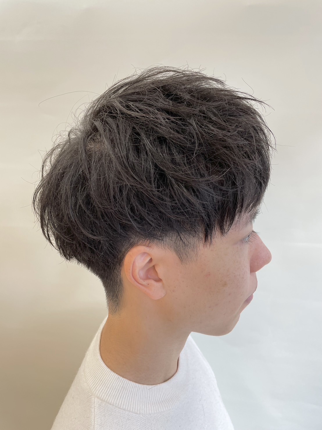 抜け感マッシュで、柔らかくもキリッと 後頭部は丸みを残しつつ、襟足・サイドはすっきり刈り上げ、清潔感と小顔効果あり! トップに動きを出す事で、軽さとふんわり感を演出。ワックスやバームで束感を作りやすいスタイル