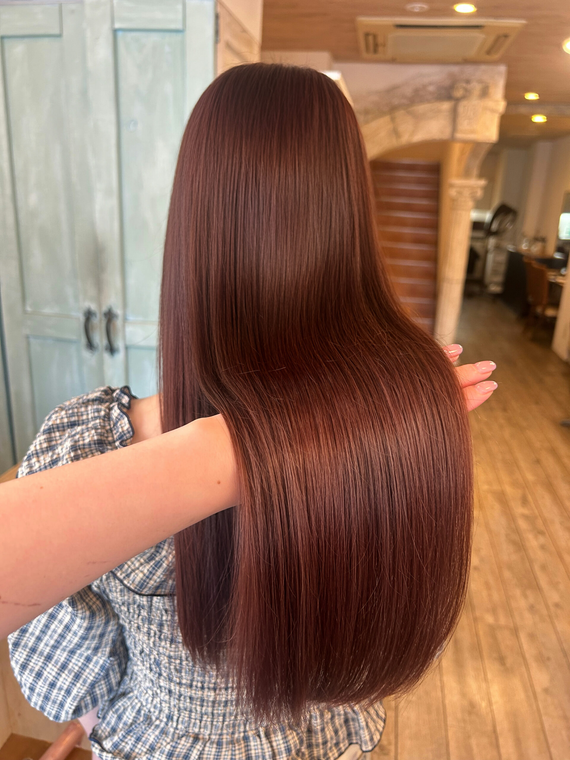 艶やかで透け感のあるレッドブラウンカラーが魅力のロングスタイル。光の角度によってほんのりピンクみを感じる柔らかな色味で、上品さの中に女性らしい華やかさをプラスします。なめらかな手触りとまとまりのあるシルエットは、髪質を美しく見せてくれる効果も◎。落ち着きがありながらも血色感を与えてくれるので、肌を明るく見せたい方やツヤ髪を楽しみたい方におすすめのスタイルです。