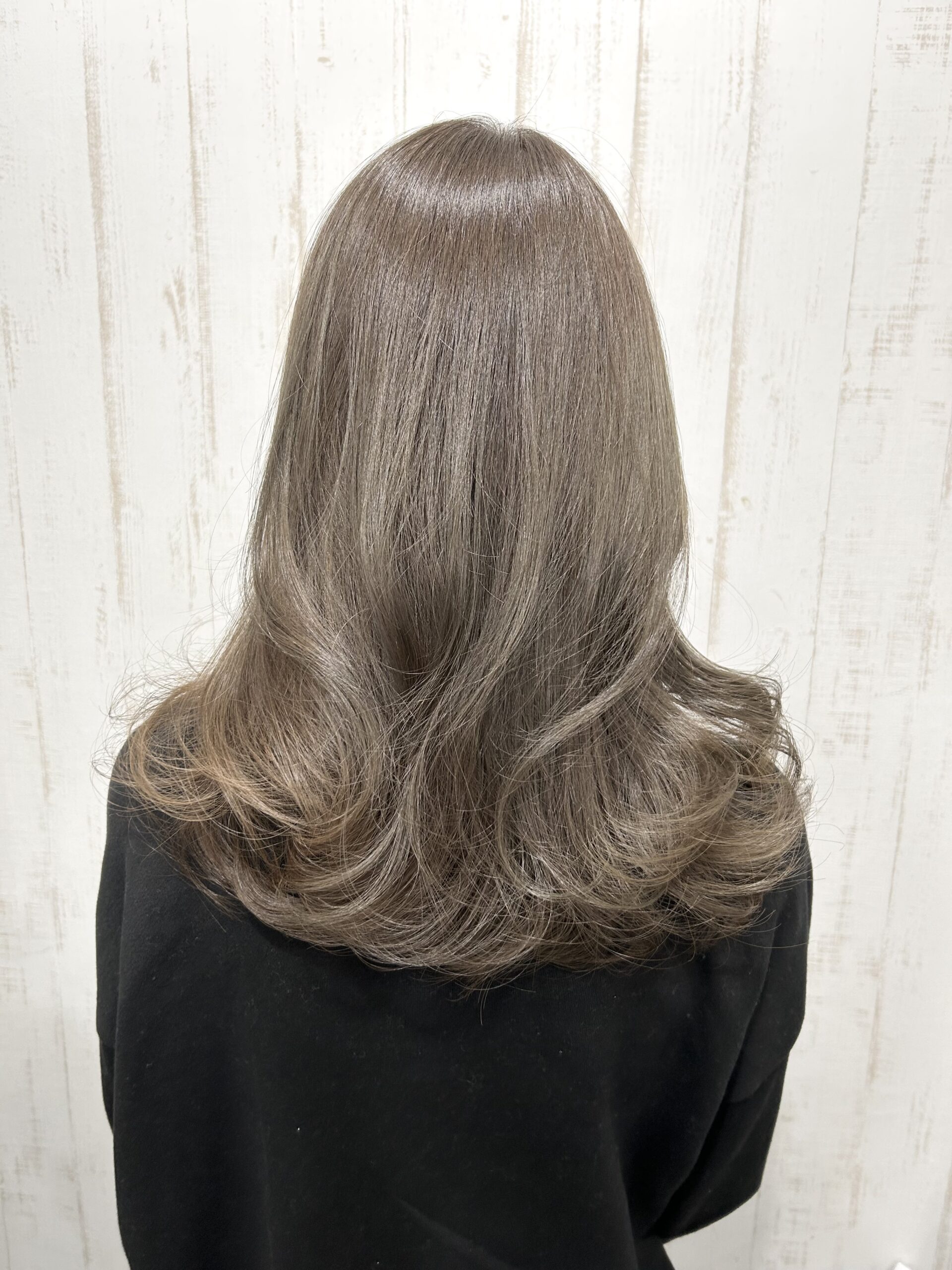 透明感あふれるシルキーグレージュカラー! 赤みを抑えた柔らかな色味で、肌なじみもよく上品な印象に。 ゆるやかな毛先の動きが軽さと抜け感を演出し、大人女性にぴったりのスタイルです。