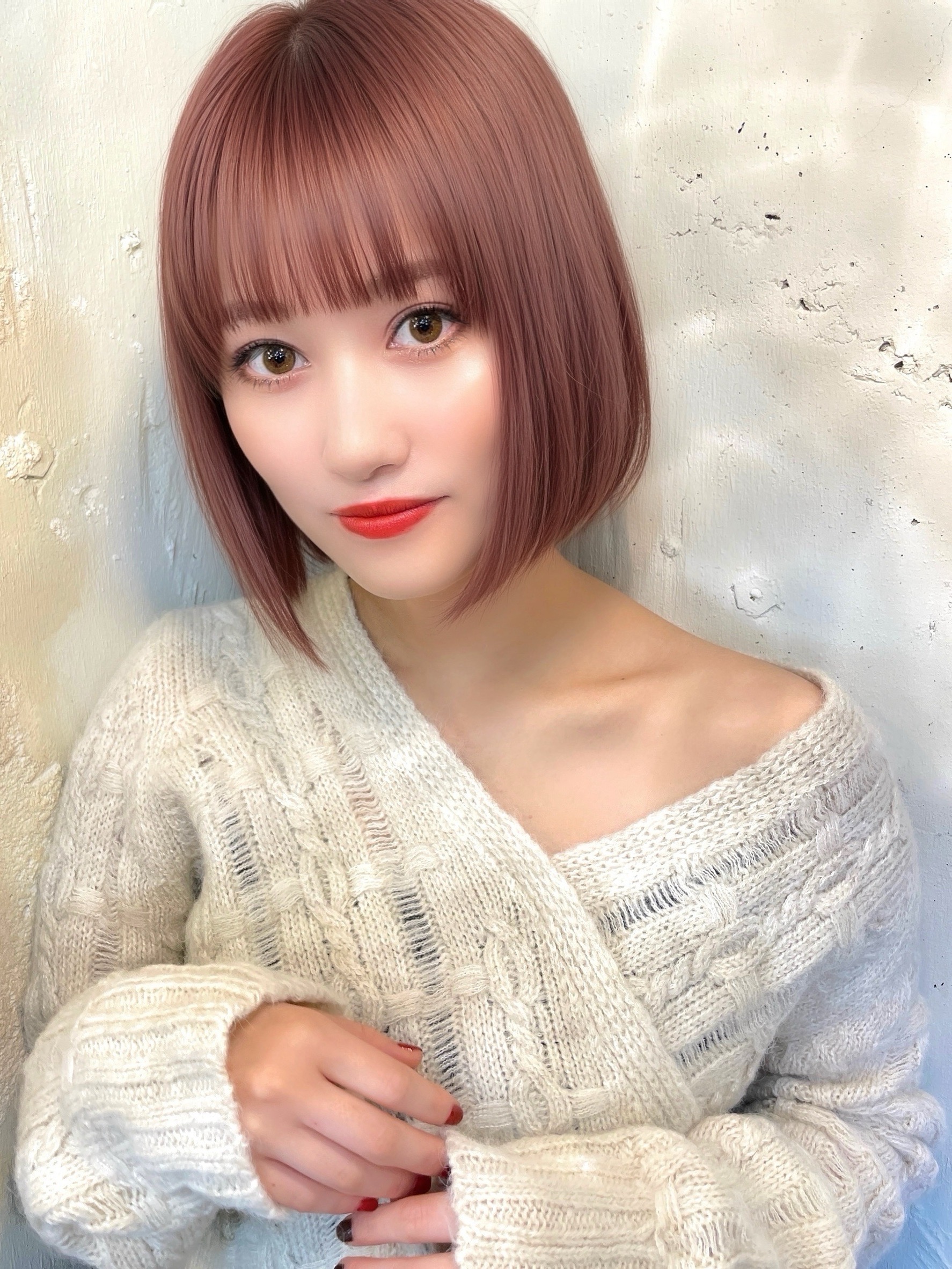 顔周りを包み込むようなあごラインボブに、ツヤ感あふれるストレート仕上げ。フルバングで目元を印象的に見せつつ、ピンクベージュカラーで肌まで明るく柔らかい雰囲気に。ナチュラルで上品な雰囲気にしたい方、ツヤのあるカラーで透明感を出したい方にオススメのスタイルです。