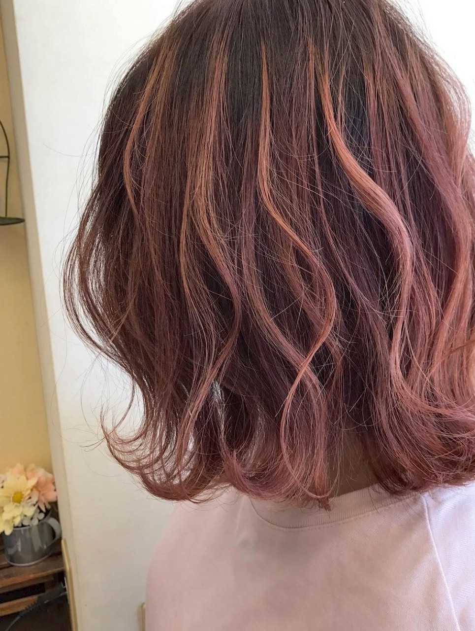 ハイライトを入れて動きも楽しめる暖色カラー! チェリーピンクなお色で顔色や雰囲気も暖かい感じに! コテで巻いても外ハネしてもハイライトが素敵なヘアスタイルです♪